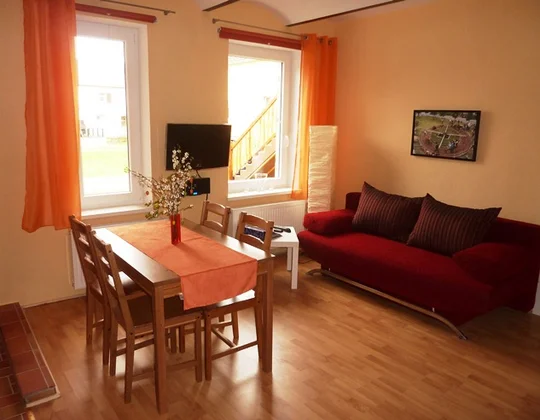 The apartments "Löwenberger Land" and "Grüneberg" are accessible for wheelchair. Particularly comfortable for wheelchair users is the apartment Lankesee, which is located on the ground floor in the old horse stable and is completely barrier-free. The outdoor facilities and stables of the farm were designed to be barrier-free, so that people with disabillities and wheelchair users have good access to the buildings and can approach the animals without restrictions. Accessible sanitary facilities are also available. The access to the newly built stable is of course also wheelchair accessible. As an ascent aid, an electric hoist was installed in the riding hall. This makes it also easy for riders with heavy handicaps.