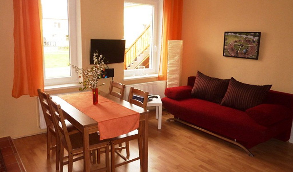 The apartments "Löwenberger Land" and "Grüneberg" are accessible for wheelchair. Particularly comfortable for wheelchair users is the apartment Lankesee, which is located on the ground floor in the old horse stable and is completely barrier-free. The outdoor facilities and stables of the farm were designed to be barrier-free, so that people with disabillities and wheelchair users have good access to the buildings and can approach the animals without restrictions. Accessible sanitary facilities are also available. The access to the newly built stable is of course also wheelchair accessible. As an ascent aid, an electric hoist was installed in the riding hall. This makes it also easy for riders with heavy handicaps.